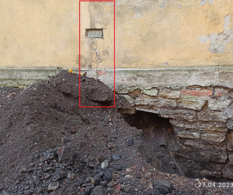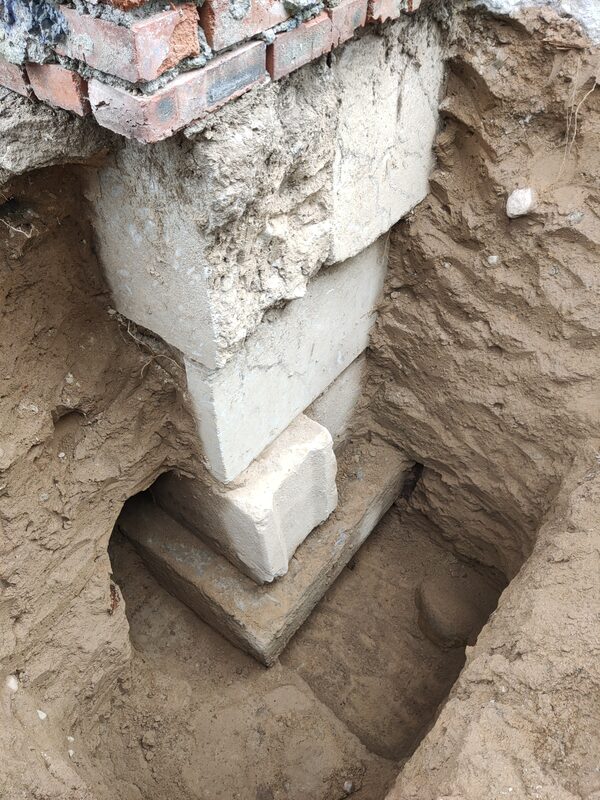 После откопки шурфа становится ясно, что причиной трещины является отверстие выполненное под инженерные сети. Отверстие выполнено без необходимой металлической обоймы или перемычки.