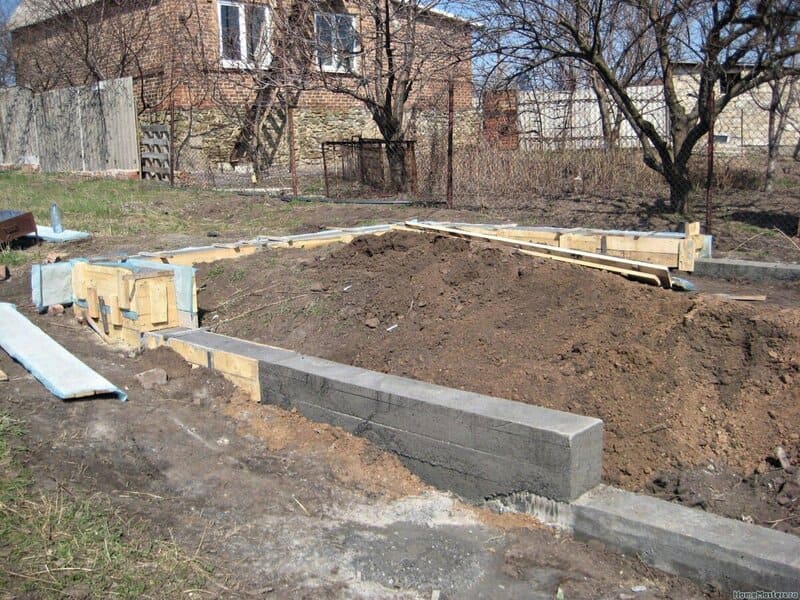 После засыхания бетона и снятия опалубки грунт засыпается обратно вдоль основания. Поверхность земли выравнивается так, чтобы она шла вровень с отмосткой.