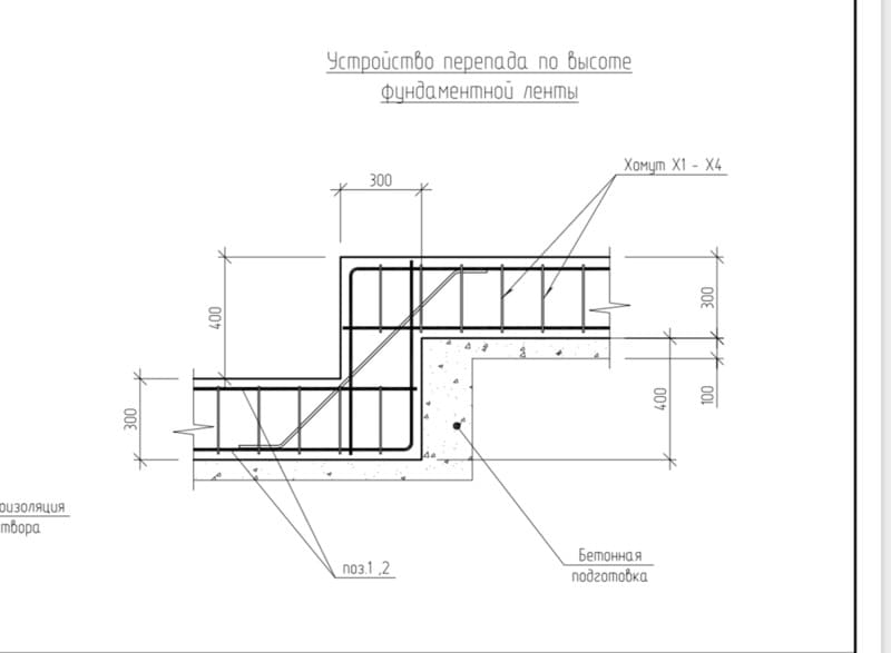 Большим перепадом высот считается разница между крайними частями фундамента выше одного метра. Здесь в нижней точке уклона основание делается на уровне почвы, а в верхней точке — по расчетному углублению. Для перехода с одного уровня на другой делают один-два уступа. На каждой секции устанавливаются опоры одной высоты.
